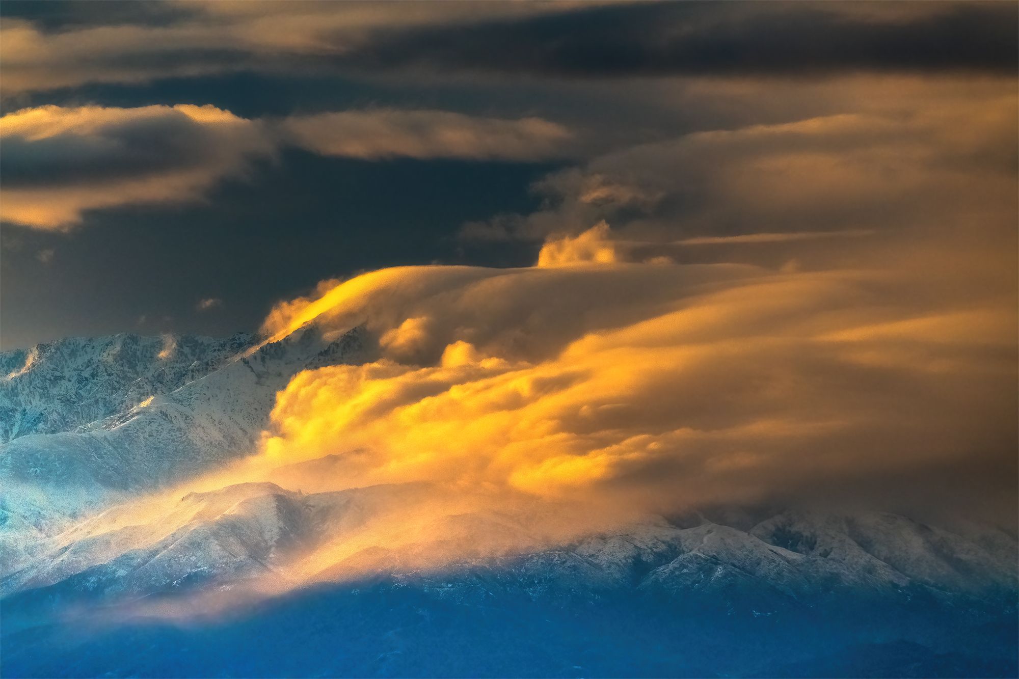 The second image awarded in the competition was quite the opposite from the Starlight Peak shot. Rather than technical climbing and sleeping from cliffs, this shot was taken from my backyard. I put a zoom lens on, and photographed the amazing moment happening over the Baldy range for about 2 hours. It was just after a winter storm, and clouds were clearing and being sculpted by the high winds to the form of the mountains.